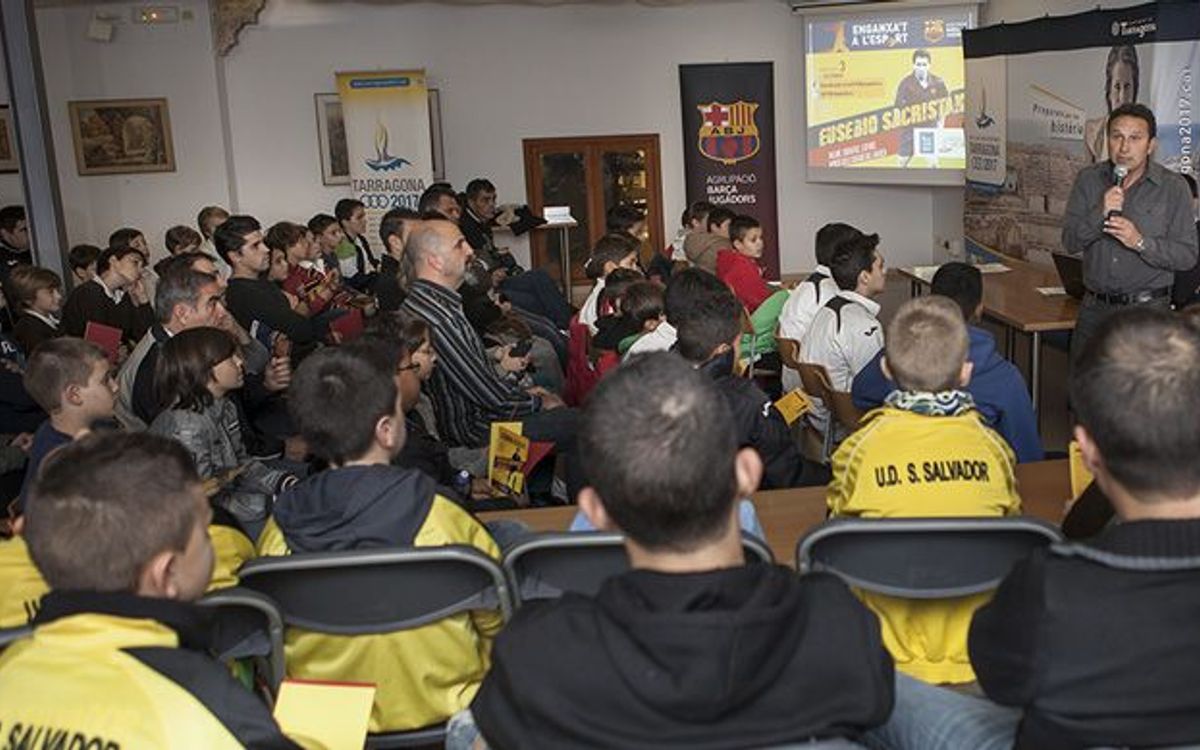 Una xerrada de l'exjugador del Barça, entrenador del Barça B i vicepresident de l'Agrupació, Eusebio Sacristán, va tancar aquest dimecres el cicle de jornades Enganxa't a l'esport corresponent al 2014. Eusebio va compartir la seva experiència amb joves futbolistes, entrenadors i pares de diferents clubs de la ciutat, com el Nàstic o Racing Bonavista, i va mostrar la seva visió del futbol formatiu: passar-ho bé i créixer com a persona i equip.